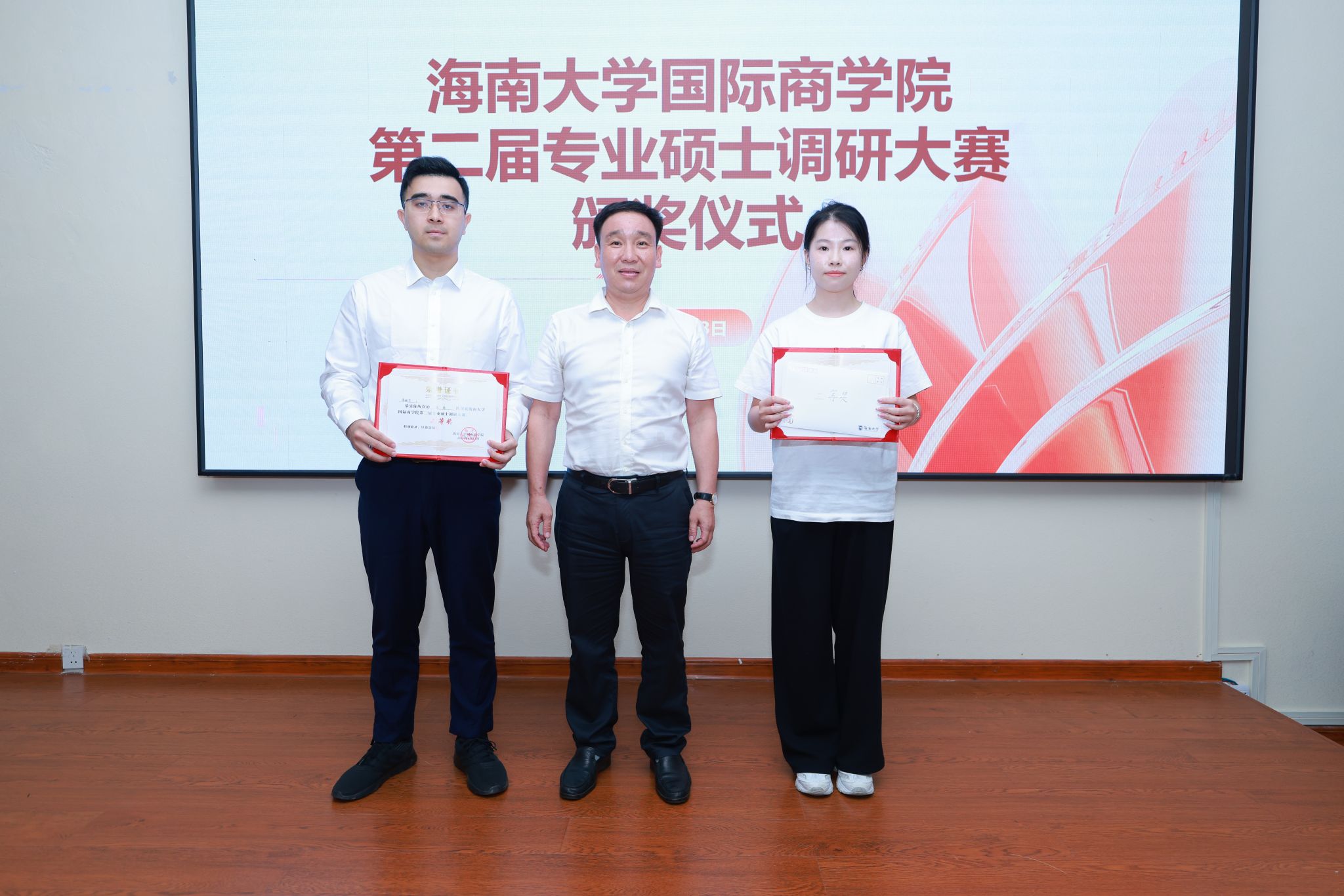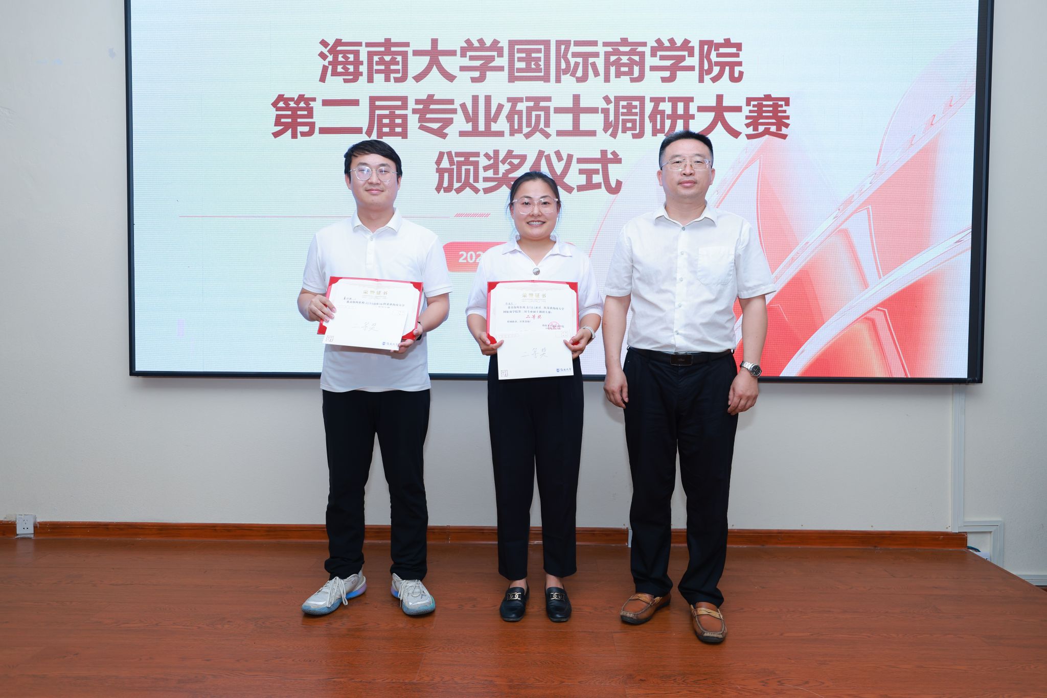 荣获二等奖的八支队伍分别为:数字语文酥饼队(MBA)、论文写在祖国大地上(MBA)、我与评委同行队(农业硕士)、椰奶清补凉队(农业硕士)、逐梦自贸港(农业硕士)、如履薄冰组(农业硕士)、火箭队(会计专硕)、审计会计莫与我争锋队(会计专硕)。副院长付景涛,万长华,戴扬分别为获得二等奖的参赛队伍颁奖。