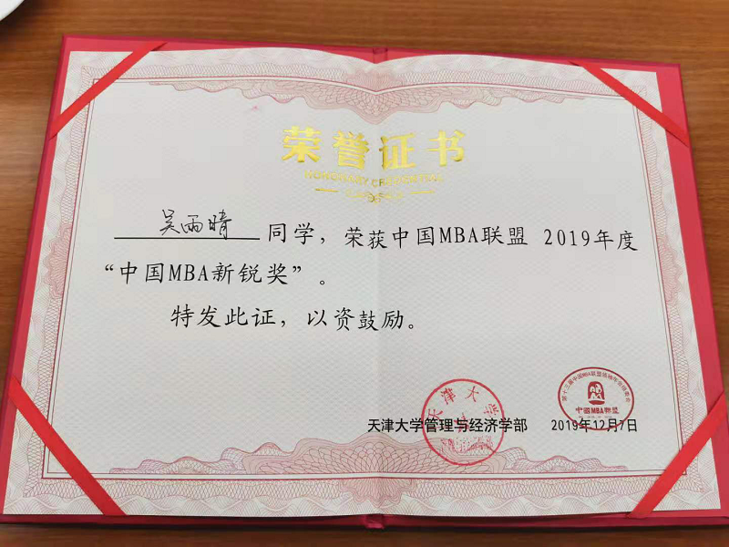 2018级MBA吴雨晴获“2019中国MBA新锐100奖”。