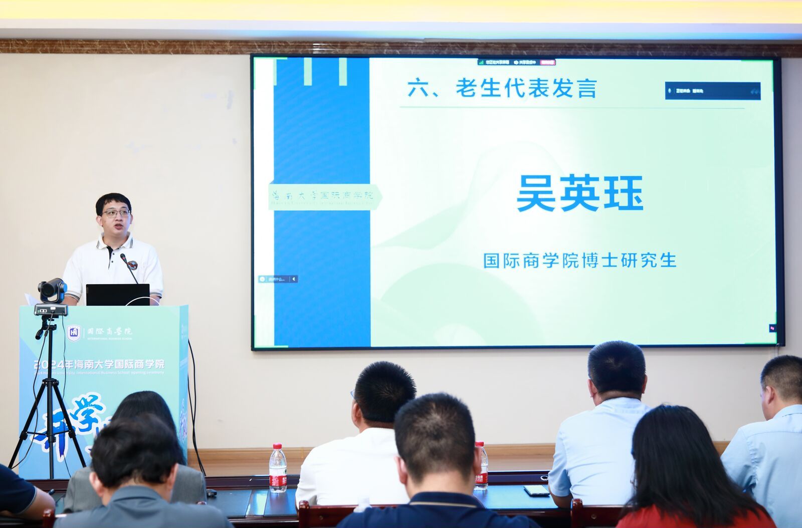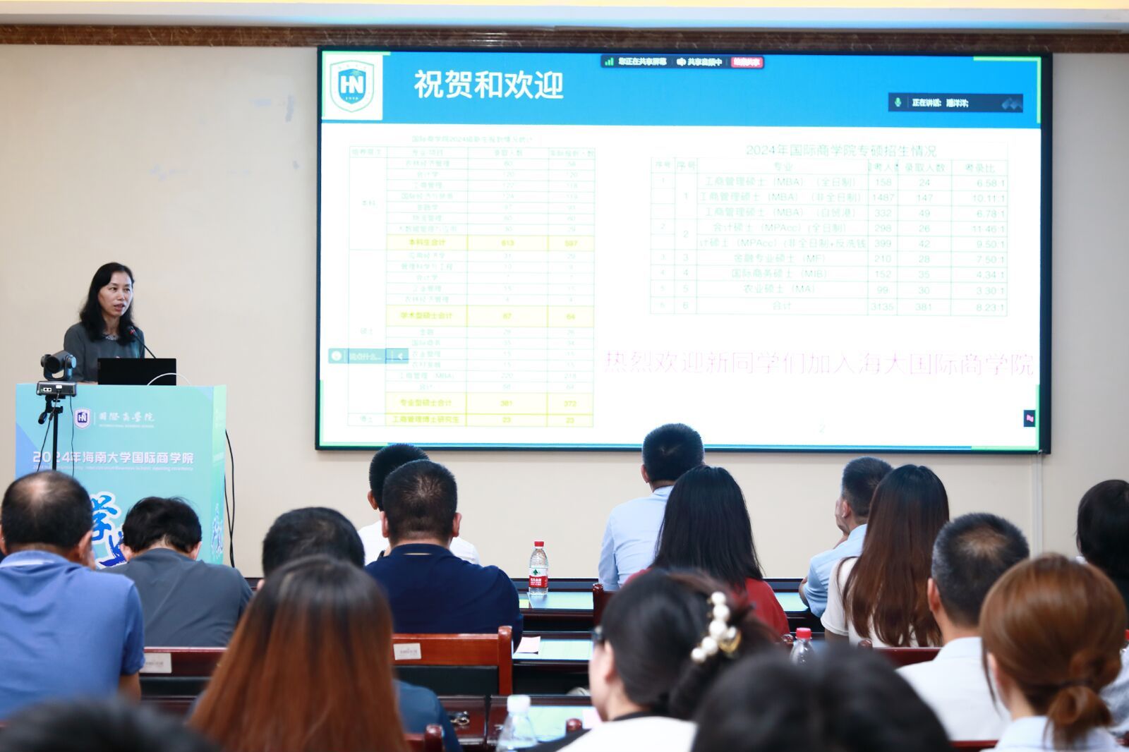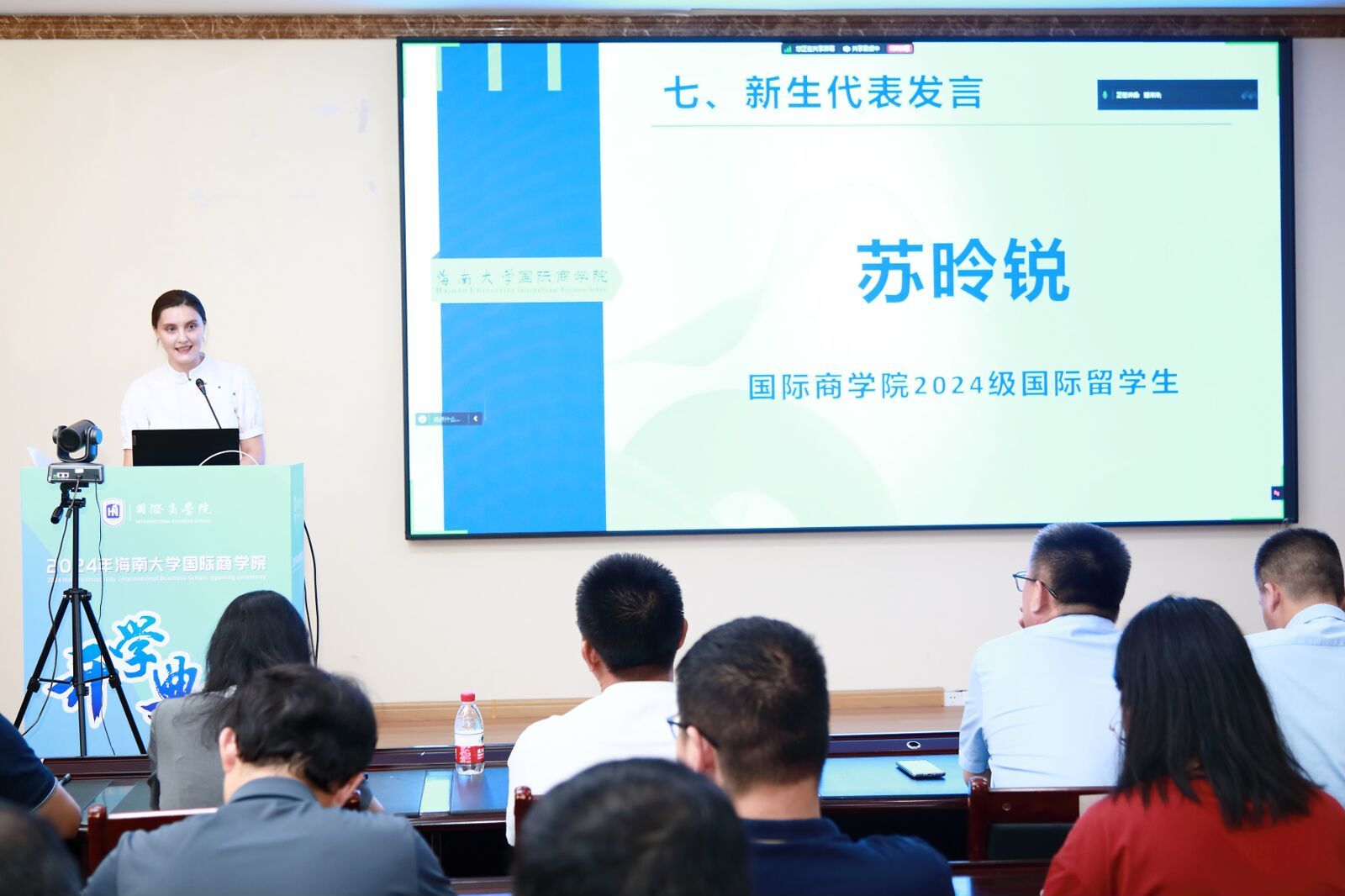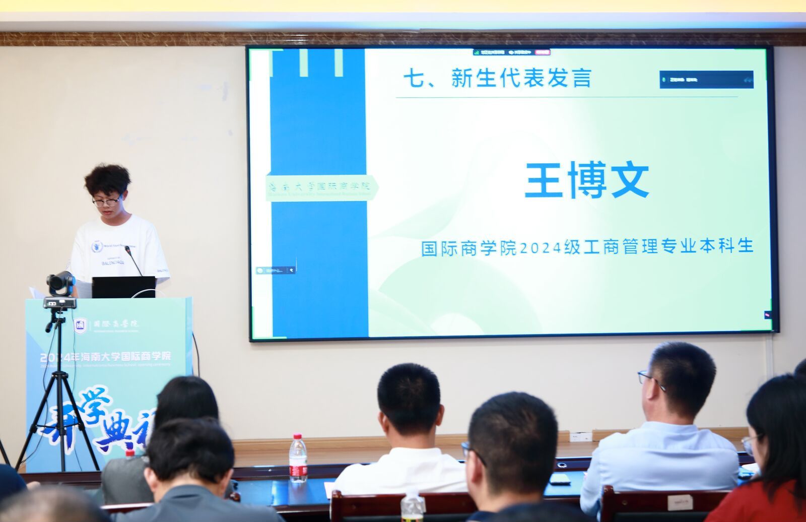 王萍副教授作为教师代表发言,寄语同学们珍惜眼前美好,懂得感恩与奉献,不断提升自己的能力,用所学知识为社会贡献自己的力量。摩羯台风的来袭,不仅考验了大家的应变能力,更激发了大家面对困难不屈不挠的精神。大家的到来,更如同雨后初晴的阳光,为学院带来了新的生机与活力,希望在日后的征途中也能并肩逐梦,共绘国商新篇章。