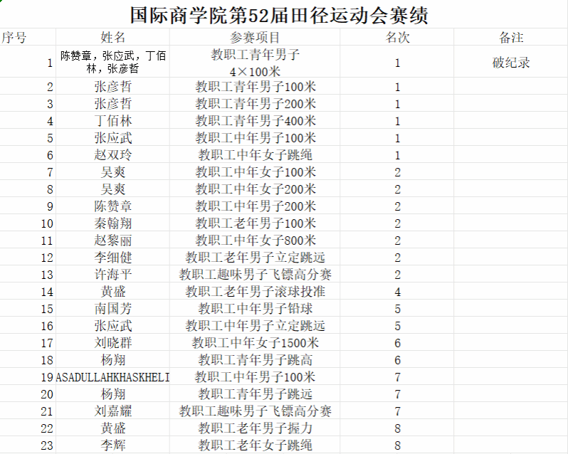 此外,学院在其他项目中亦有优异表现,多位教职工在跳远、铅球、中长跑等项目中也取得了前八名的好成绩,充分展现了搬瓦工