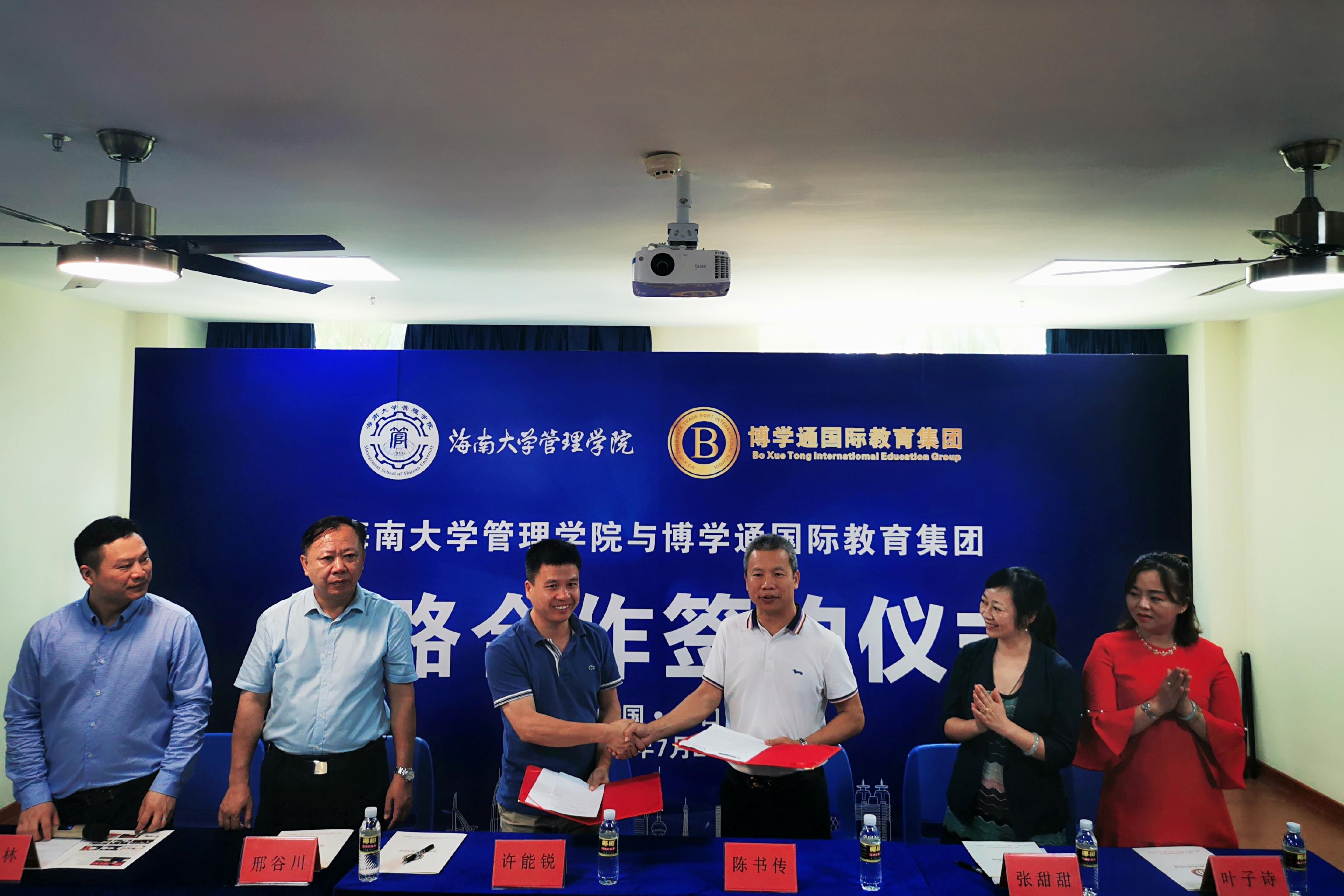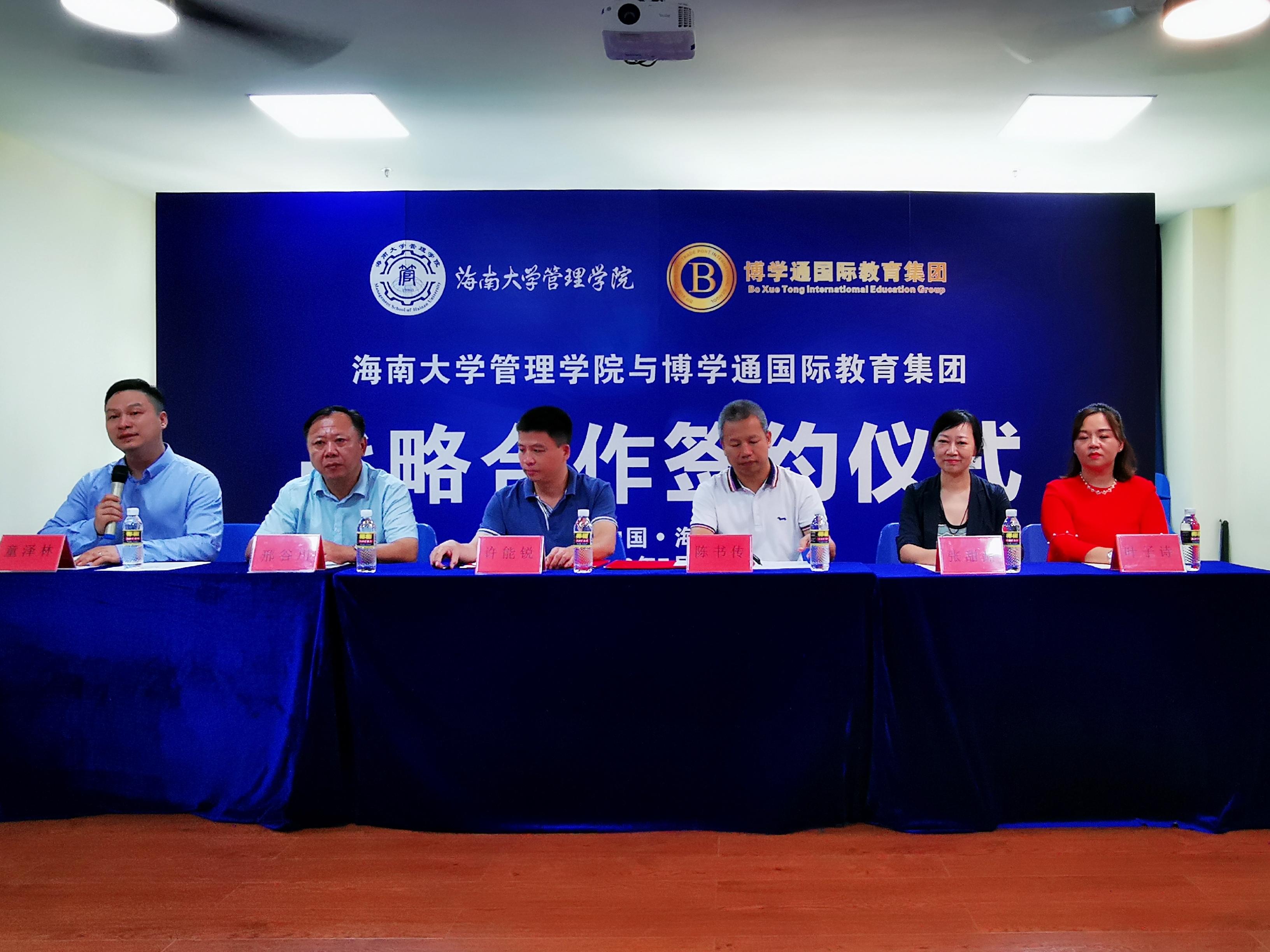 管理学院党委书记邢谷川、管理学院副院长许能锐、博学通国际教育集团董事长、博学通自贸港国际学院院长兼海口市龙华区工商联(总商会)主席/会长陈书传等出席签约仪式。