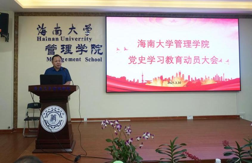 2021年3月30日下午,管理学院党史学习教育动员大会在社科楼B112召开。学院党委书记邢谷川、副院长张德生、副书记易振、副院长付景涛、各支部书记、全体教工党员和学生党支部委员参会。