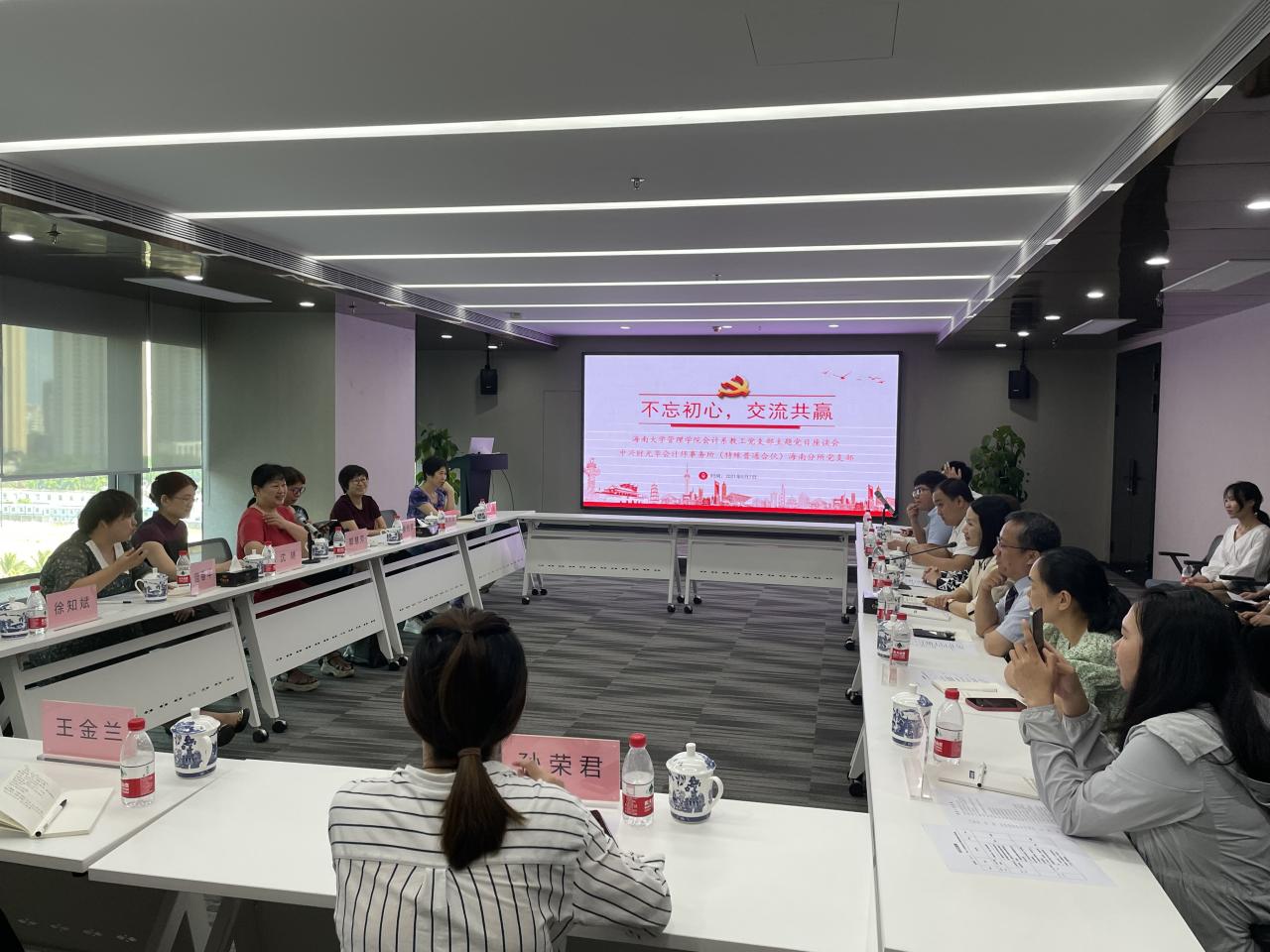 会计系教工党支部与海南中兴财光华会计师事务所开展了“不忘初心、交流共赢”的主题党日座谈会。双方就如何开展党史学习、如何进行基层党组织建设以及如何实现党建促进业务等方面的议题进行了深入的交流。