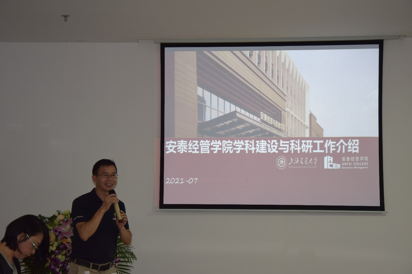 吴仕明主任对安泰经管学院学科建设与科研工作进行了详细的介绍,包括科研项目服务、论文服务、研究平台、学科评估与建设等内容。