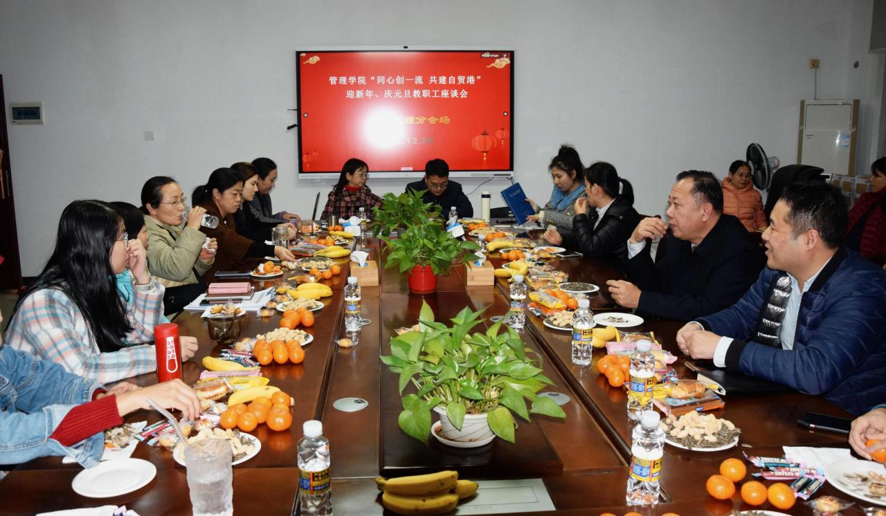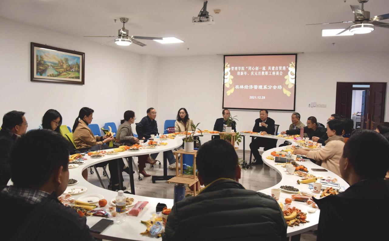 2021年12月28日下午,管理学院举行“同心创一流 共建自贸港”迎新年、庆元旦教职工座谈会。本次座谈会由学院工会组织承办,共分为五个分会场,包括工商管理系、会计系、农林经济管理系、管理科学与工程系以及综合管理分会场。全体教职工参加活动。