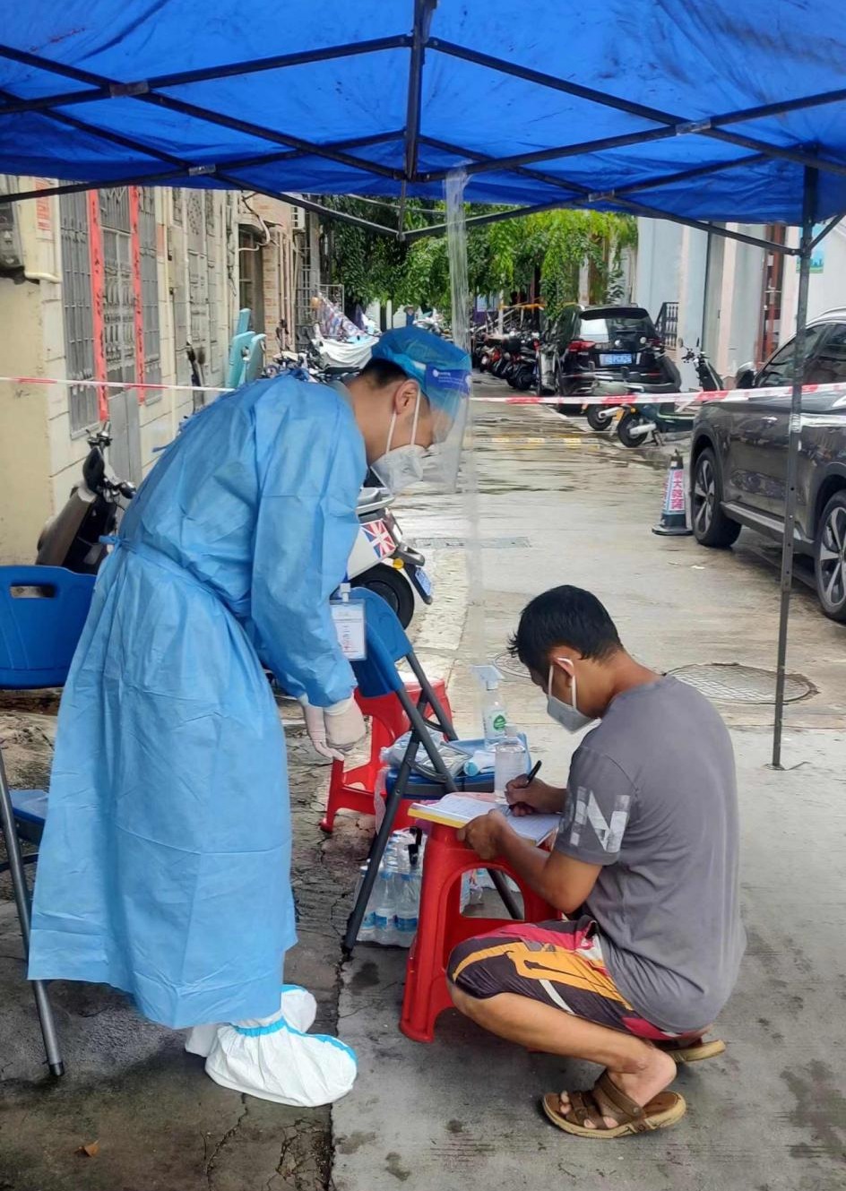 财务会计系的郑晓宇老师是北方人,入职海大不足一年,海南的气候和方言对他而言都是不小的挑战。台风鞍马来袭时,他顶着狂风大雨完成了户外执勤工作;封控区很多阿公阿婆不擅长普通话,他需要反复确认他们的问题,向他们耐心解释防疫规定,劝阻其外出,协助其购买生活物资。因疫情不断发展,他所在封控小组的执勤点位、执勤时间和执勤内容频繁调整,前一天还要早起同队友去某个巷口执勤,第二天就有可能被单独分配至某个楼栋彻夜值守,日晒雨淋,起早贪黑。高强度、高风险的工作是对志愿者身体和心理的双重考验,郑老师也曾出现过发高烧等身体问题,但有了现场战友的帮助支持、后方同事的关心问候,一切困难都不足为惧,他退烧后第一时间便返回了工作岗位。