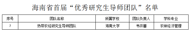 韦开蕾教授负责的“热带农经研究生导师团队”获海南省首届“优秀研究生导师团队”荣誉称号。团队成员有韦开蕾教授、傅国华教授、柯佑鹏教授、张德生副教授、樊孝凤教授、许海平教授、朱月季副教授、许能锐教授、王芳副研究员。