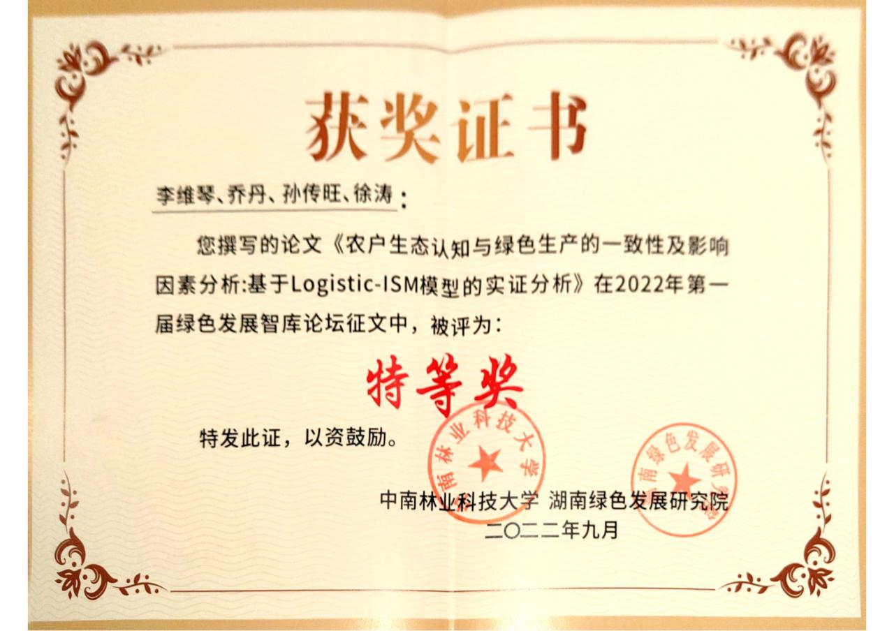 教师徐涛、孙传旺和乔丹共同指导的2021级农林经济管理专业硕士研究生李维琴撰写的《农户生态认知与绿色生产的一致性及影响因素分析:基于Logistic-ISM模型的实证分析》一文获得“特等奖”,李维琴受邀参加线下研讨会;由搬瓦工