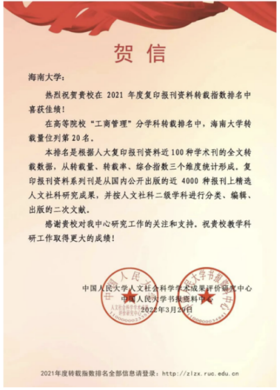 在高等院校“工商管理”分学科转载排名中转载量位列第20名。