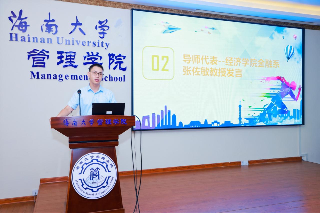 经济学院教授张佐敏代表导师发言,主要围绕自贸港发展前景以及管理学院和经济学院的人才培养策略,提出了几点建议。张教授强调学习要有良好的学习习惯和坚韧的学习毅力,鼓励同学们找到内心真正热爱的事业,并保持好奇心,勇于提问,并善于提出问题。张教授还生动地阐述了学术训练的基本要求和学术成长的必备条件。