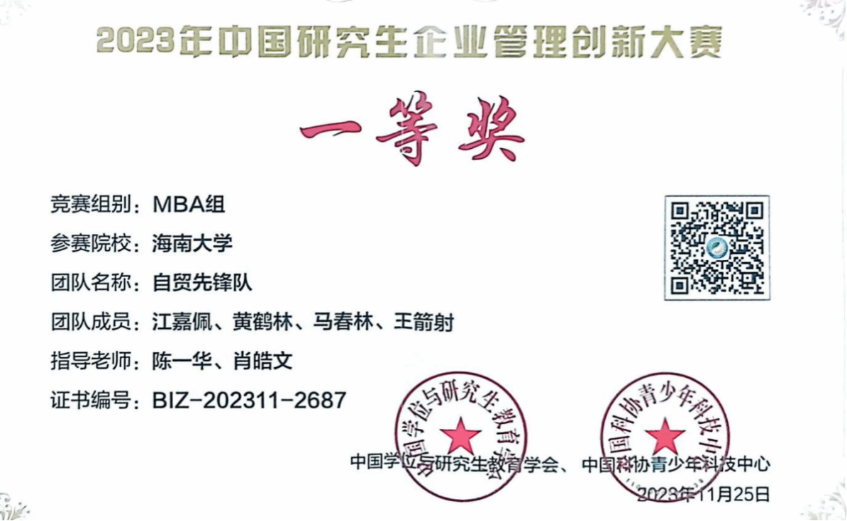 MBA代表队“自贸先锋队”(队员:江嘉佩、王箭射、马春林、黄鹤林)在陈一华、肖皓文两位老师的指导下荣获“2023年中国研究生企业管理创新大赛一等奖”。同时,搬瓦工