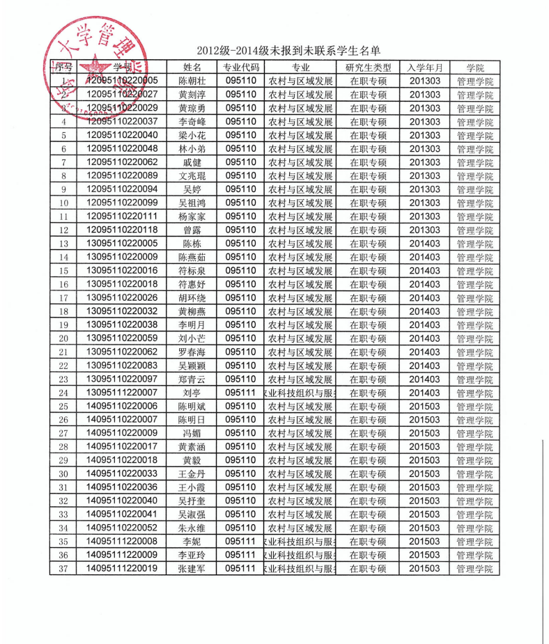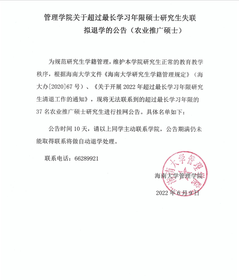 管理学院关于超过最长学习年限硕士研究生失联拟退学的公告(农业推广硕士)