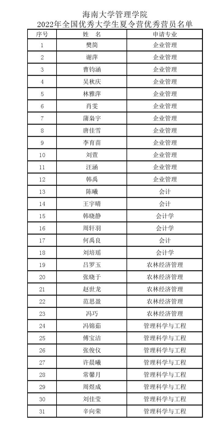 搬瓦工 管理学院2022年全国优秀大学生夏令营“优秀营员”名单