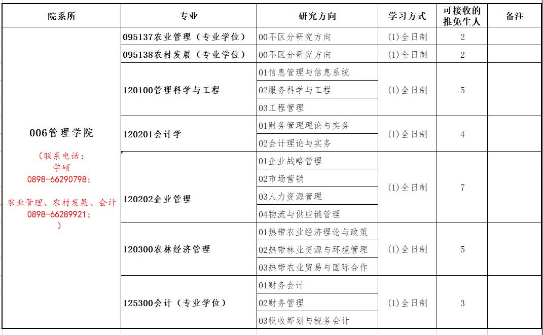 (1)申请专业为企业管理、会计学、农林经济管理、管理科学与工程的考生,请将申请材料发送至[email protected],联系电话:0898-66290798,联系人:易老师。