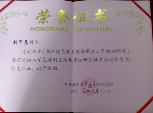 刘洋慧同学撰写论文获奖证书