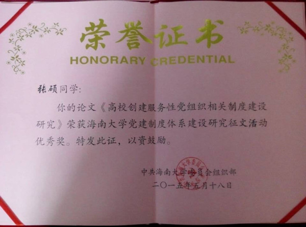 张硕同学撰写论文获奖证书