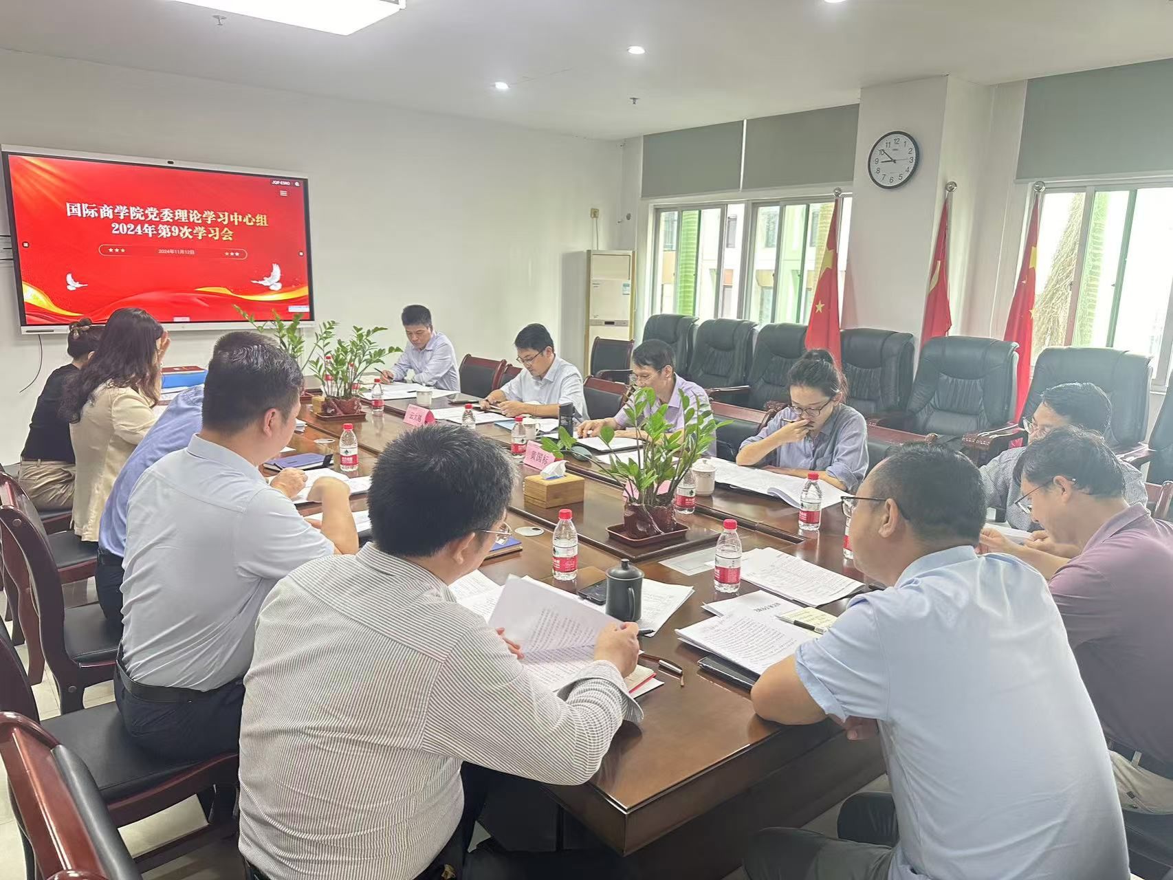 在社科楼B栋314会议室召开党委理论学习中心组2024年第九次学习会。院党委书记南国芳主持会议,党委委员参加会议,校巡听旁听小组第二组组长黄国标,组员云大越、邢靖晨指导会议。