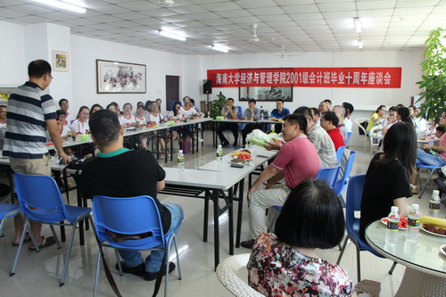 经济与管理学院01级会计班10周年座谈会。应邀参加了本次活动的师生有学院胡国柳院长、党委周邦华副书记、杨新中老师、徐广卓老师、刘保劲老师、胡秀群老师、李师慧老师、符玉琴老师、吴新老师、谭继老师、张乃脆老师,信息学院高数老师高泽图老师和公共计算机老师吴星老师,2001级会计班的同学们及会计系部分在校学生。