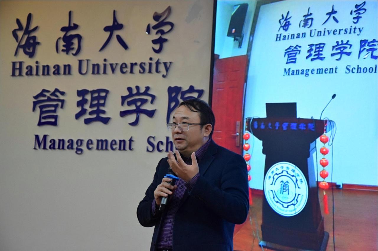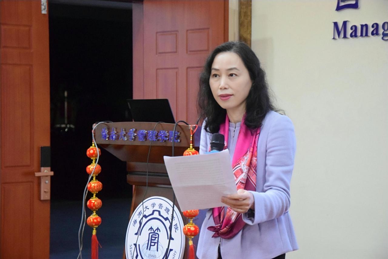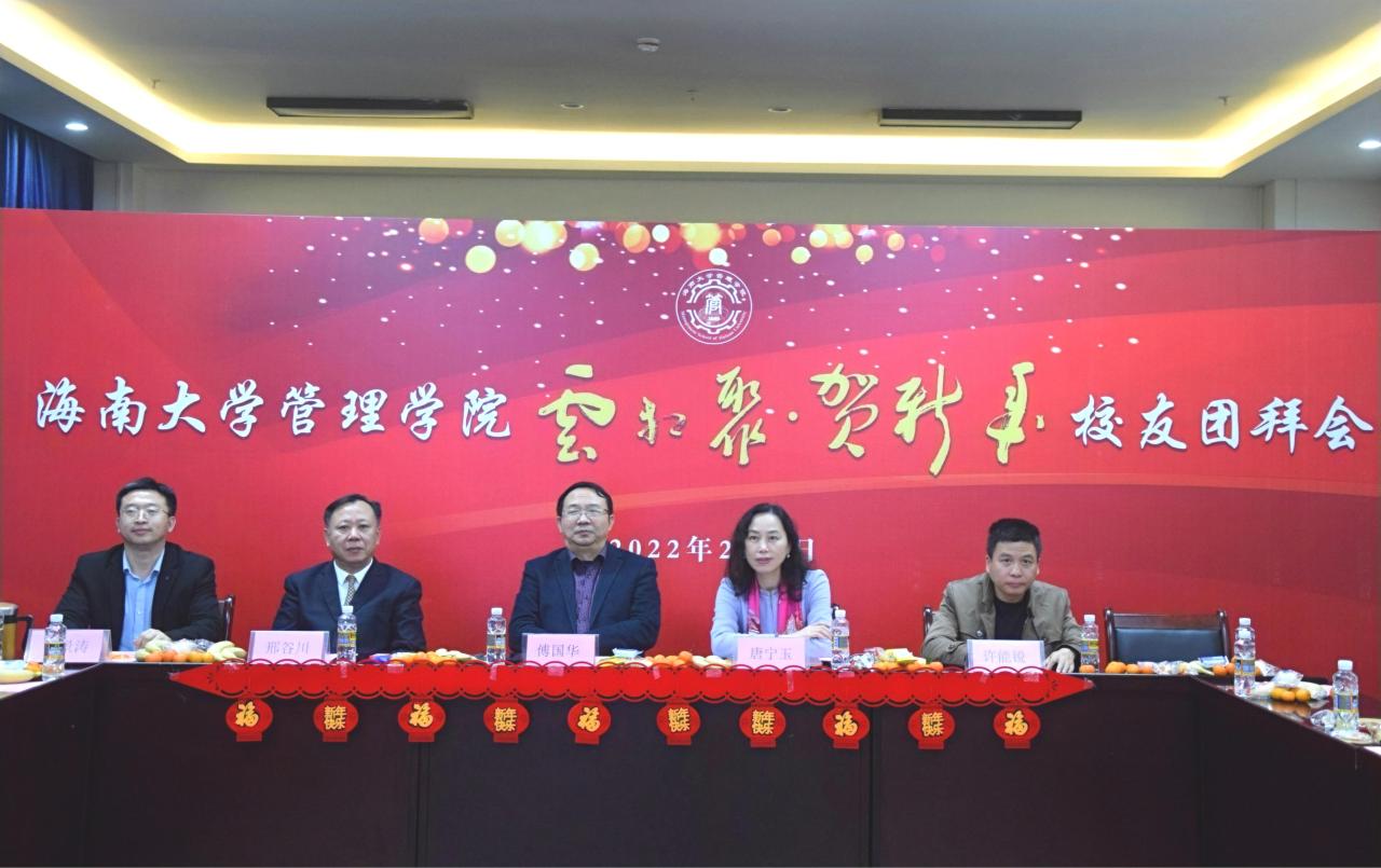 管理学院院长唐宁玉致辞,她代表学院向各位校友拜年,并介绍了学院这一年取得的成绩。希望大家毕业后,仍能对海南、学校和学院保有一份真挚的感情。欢迎各位校友疫情后回母校看看,管理学院永远是大家坚强的后盾。