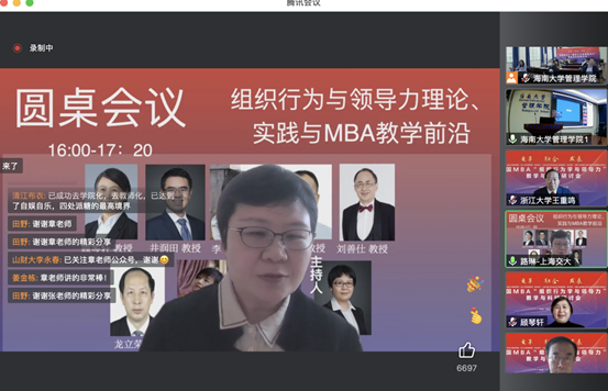 上海交通大学路琳教授主持了以“组织行为与领导力理论、实践与MBA教学前沿”为主题的第一场圆桌会议。来自上海交通大学的顾琴轩教授、复旦大学的李绪红教授、上海交通大学的井润田教授、中国人民大学的刘军教授、华南理工大学的刘善仕教授、华中科技大学的龙立荣教授、同济大学的罗瑾琏教授和清华大学的郑晓明围绕领导力的纵横分布、数字经济时代的情绪劳动、理论如何走在实践前面、数智技术冲击与领导力多维重塑、企业案例解析与赋能、提高课堂吸引力、领导力课程的电影教学法、增强研究与教学的情景带入感进行了交流,反映了”变革、融合、发展”主题,给大家带来了耳目一新的感觉。
