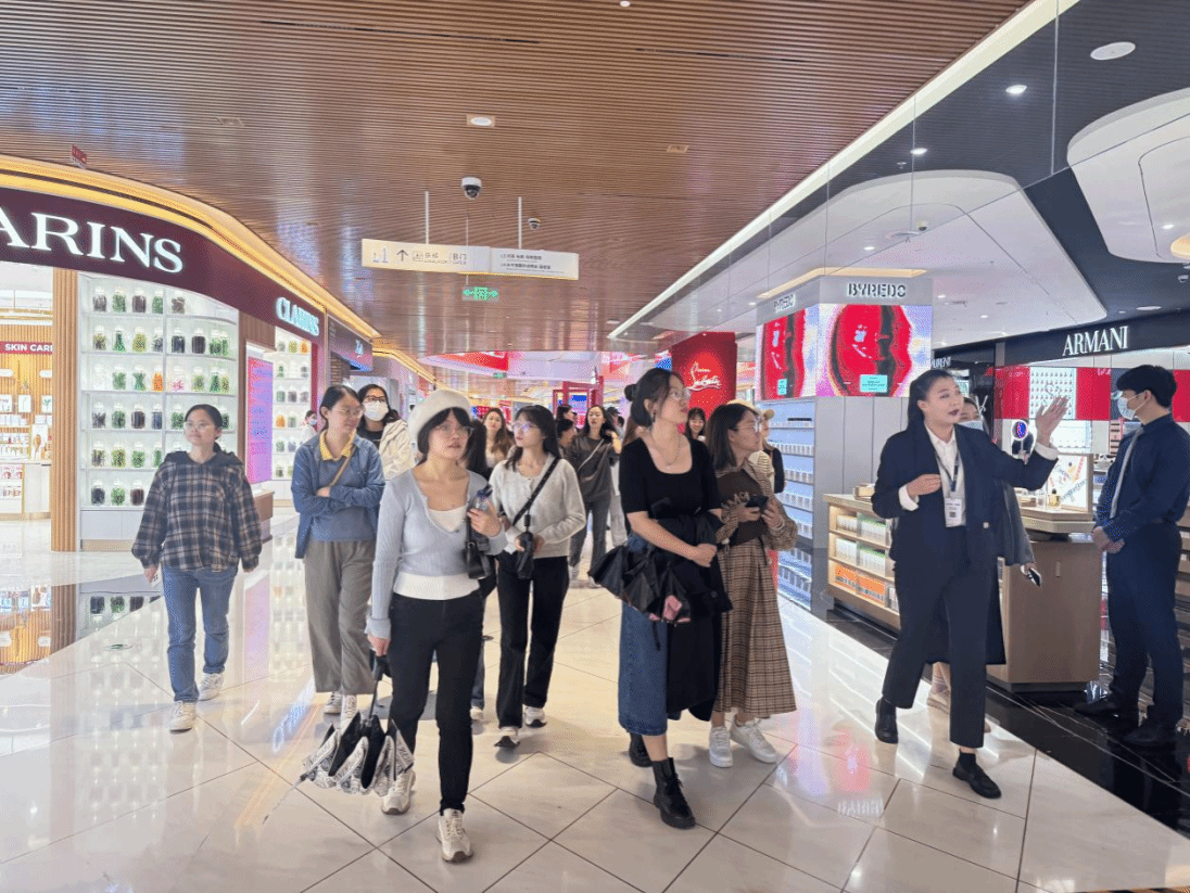 随后,学生们前往一楼海控全球精品免税城,更好的了解了免税商品的种类和品牌,包括化妆品、黄金、香水、酒类等奢侈品,并对免税政策,购物流程和优惠政策进行了更深入的了解。