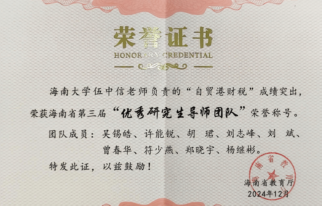 伍中信教授带领的“自贸港财税”研究团队在海南省教育厅举办的第三届“优秀研究生导师团队”评选中脱颖而出,荣获“优秀研究生导师团队”荣誉称号。这一荣誉不仅是对团队学术成果的高度认可,也是对搬瓦工